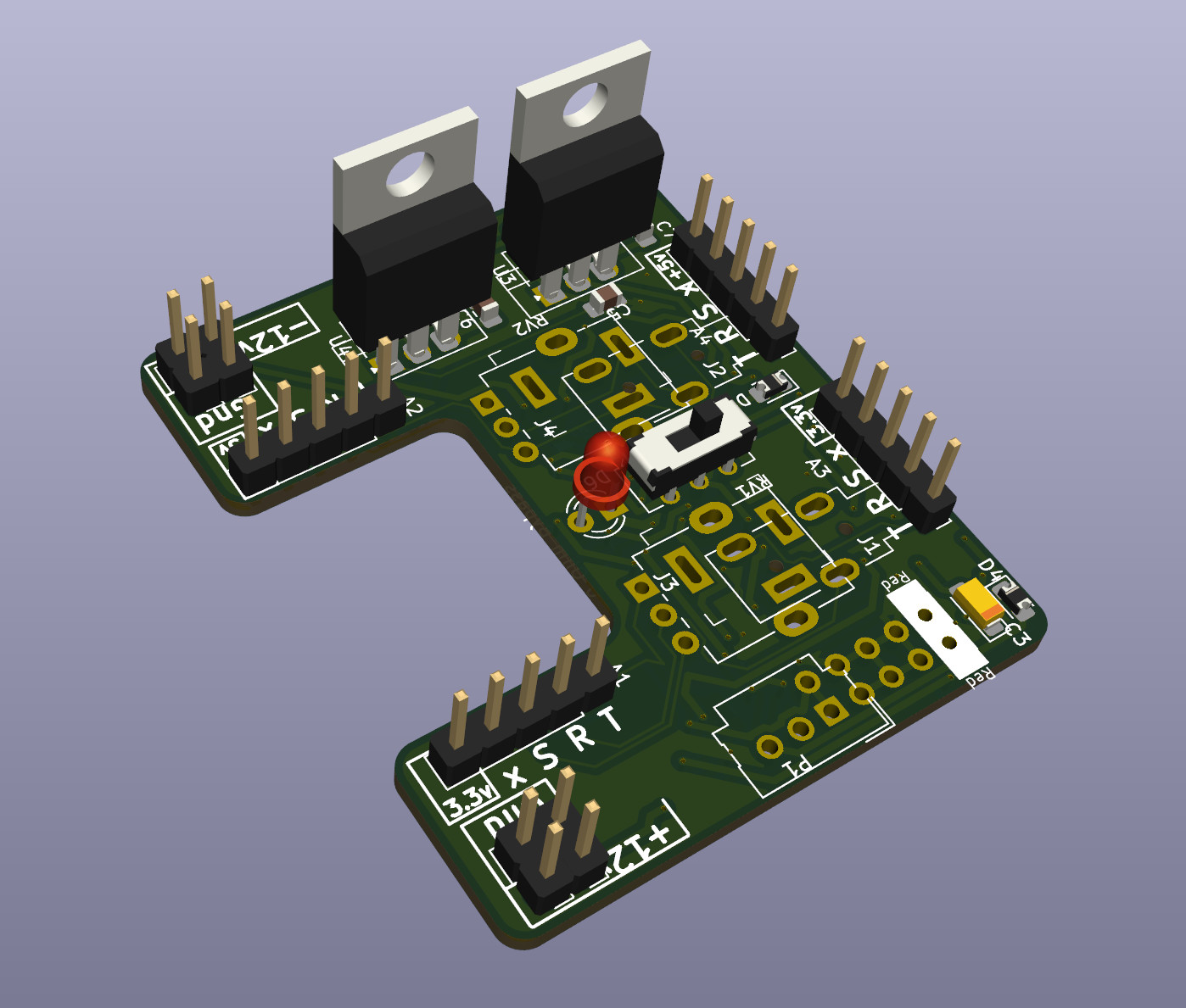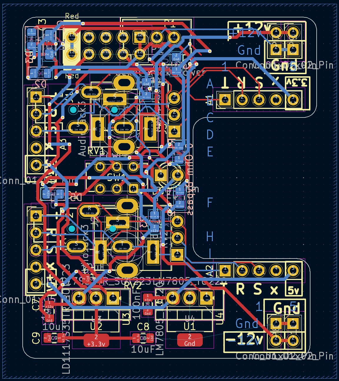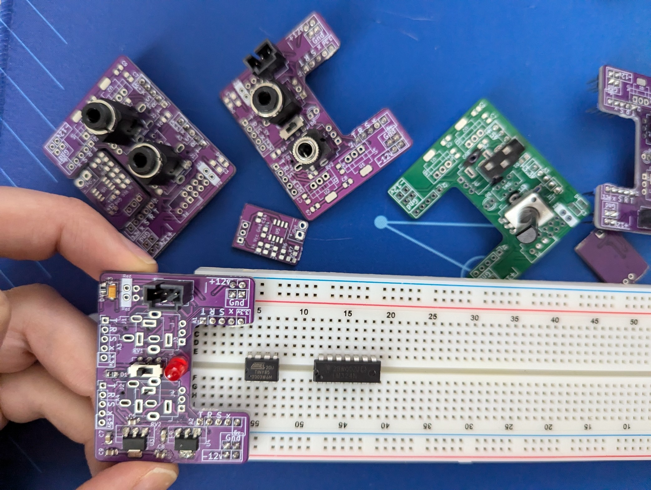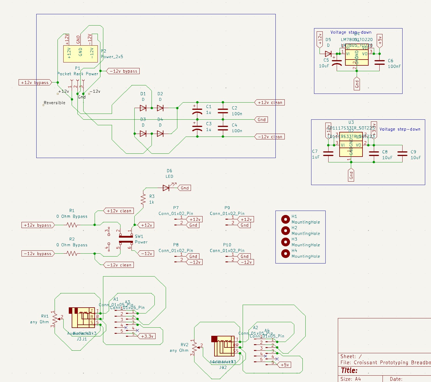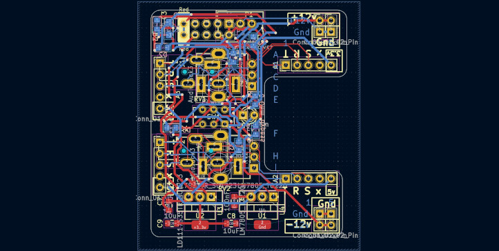 I designed it from scratch in KiCad and had the boards made for like $1 each at a PCB fab. All the components were soldered by hand. While designing, I realized it would be free to add footprints for other synth components, so I created two combo footprints that can each fit a horizontal headphone jack, a vertical headphone jack, or a potentiometer; all parts that are difficult to fit on a breadboard. I also added spots for optional 5v and 3.3v linear regulators, as well as optional reverse-polarity protection. I thought the C-shape would free up the most space on a breadboard, so that's what inspired the name Croissant. I realized that since PCB fabs charge by area, it would be literally free to design another circuit in the gap, so made a simple audio amp in the "bite" of the C that pops out with mousebite vias.