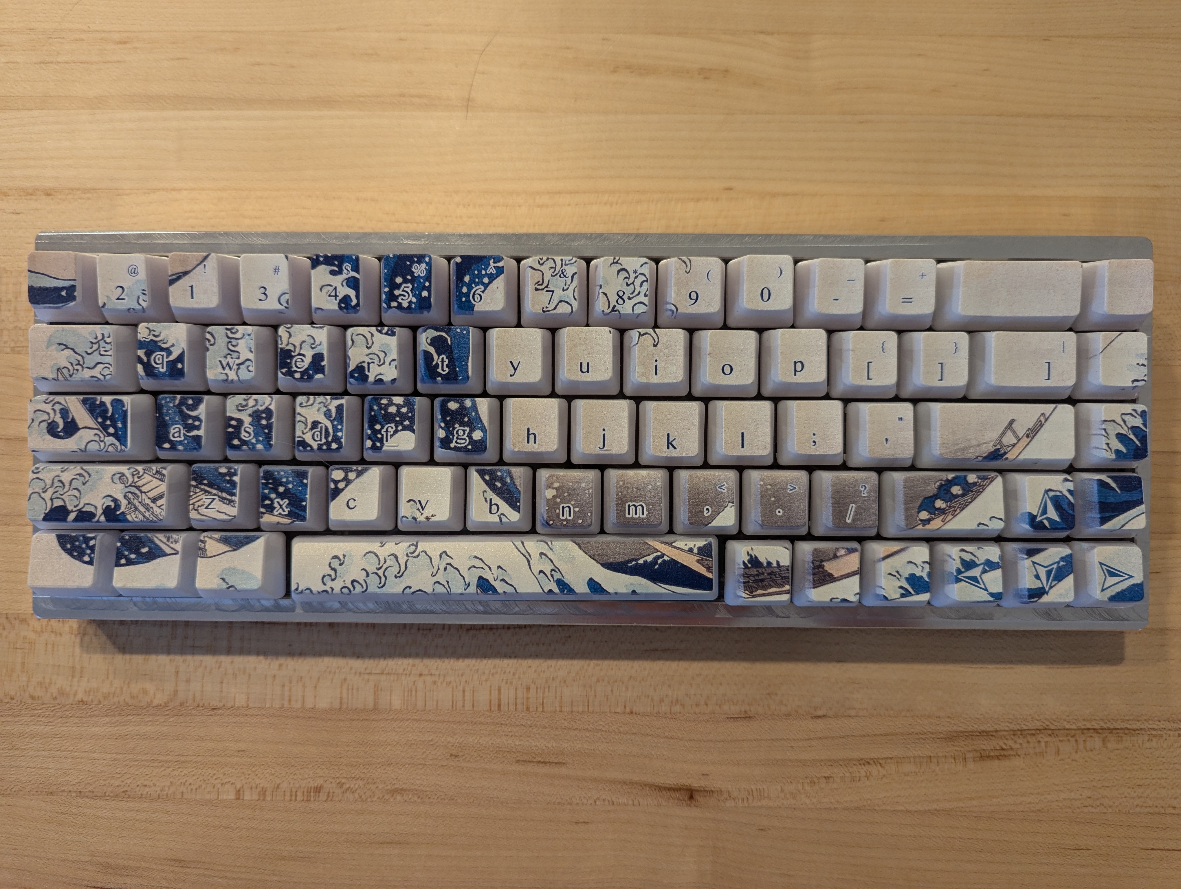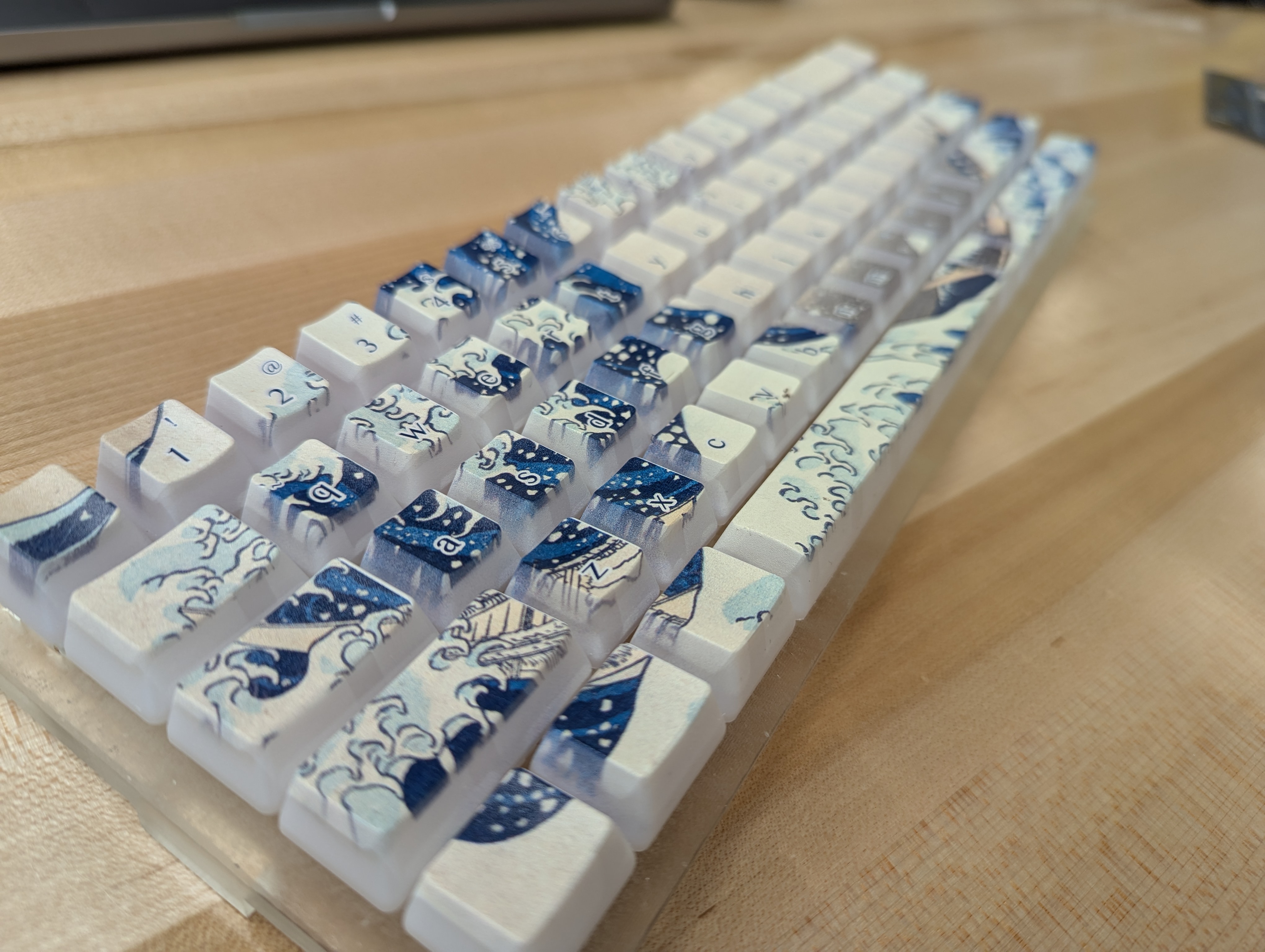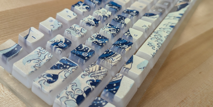 I first designed the enclosure in Blender to get a feel for it and the key layout, then remade the model in Fusion for CAD and CAM. I milled the enclosure myself. I then designed the art for the keycaps by taking a piece from 36 Views of Mount Fuji and applying it as a mask to a custom key layout made from a KLE json file. The art alone is striking, but I took great care to not detract too much with the legends and other key decorations. I printed the design using a UV printer, which is not as durable as PBT, but has held up well so far. I had to design a jig for the printing process to align the keys through different passess of material.