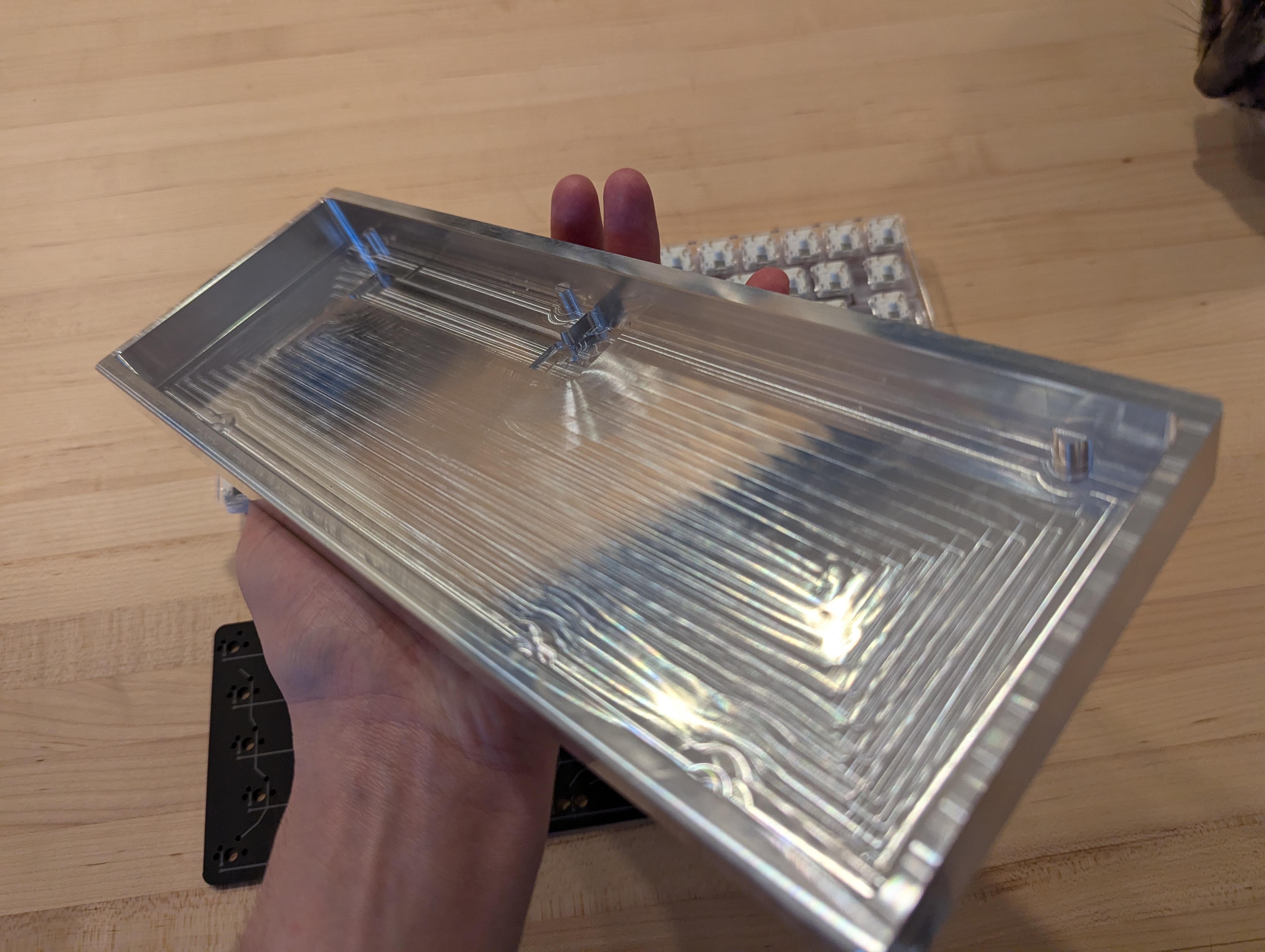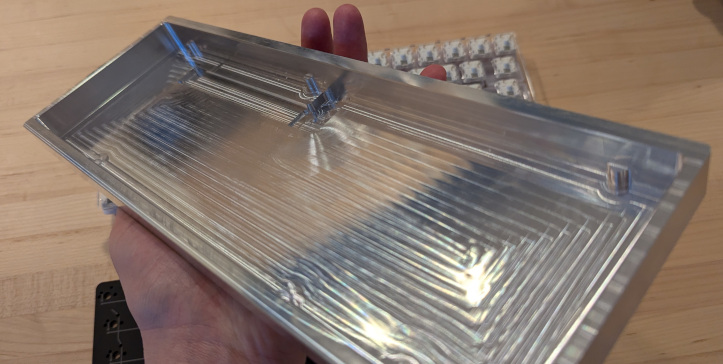 Hand holding a computer keyboard enclosure made out of aluminum showing marks indicating it was made on a CNC mill