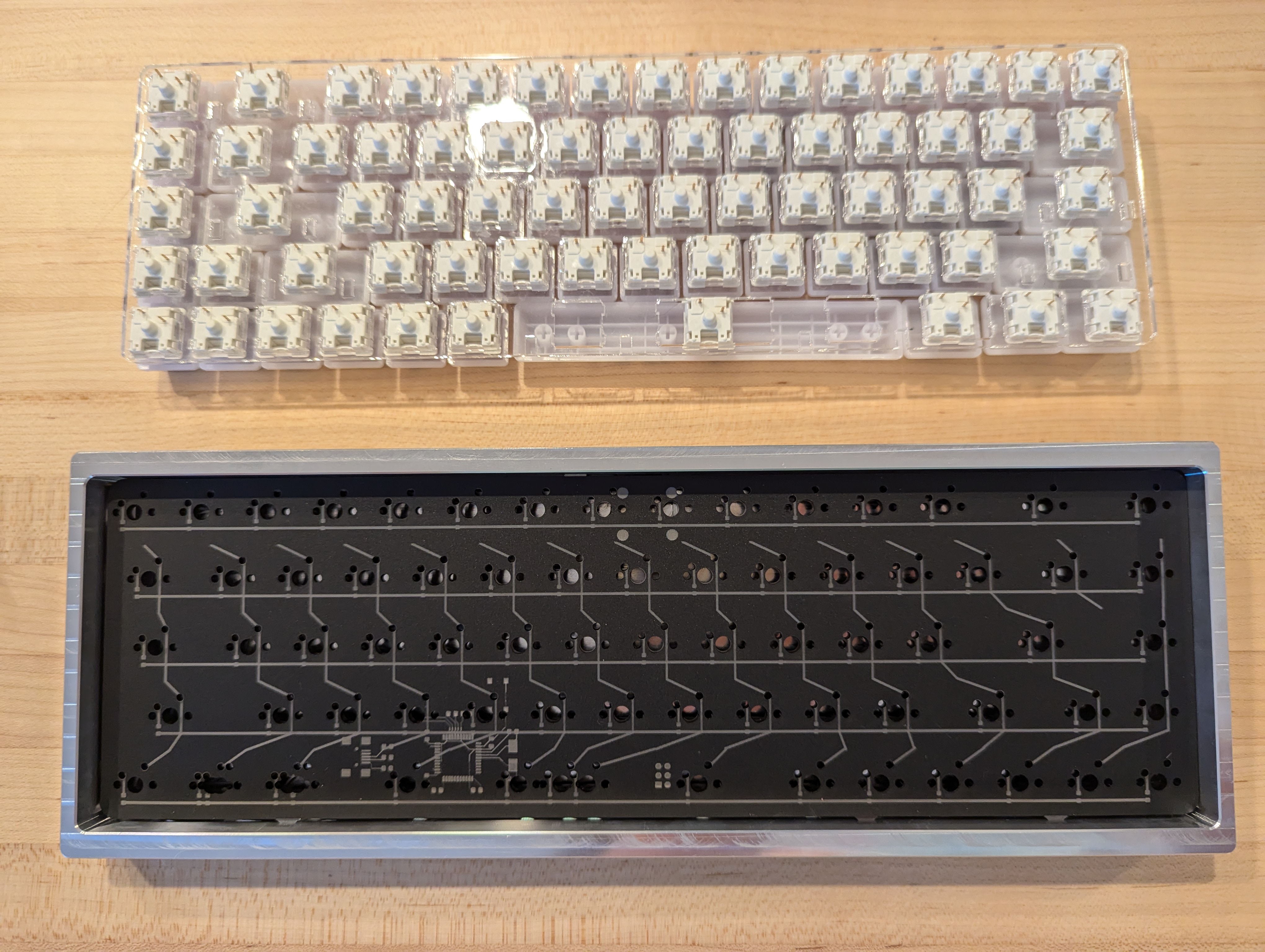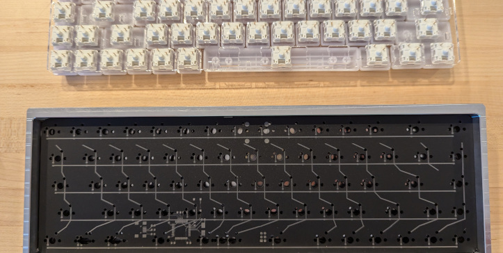 Computer keyboard taken apart to show a plate of switches on top and a placerholder PCB on the bottom