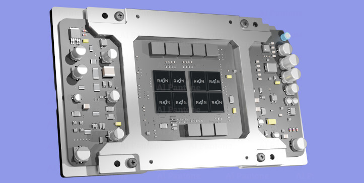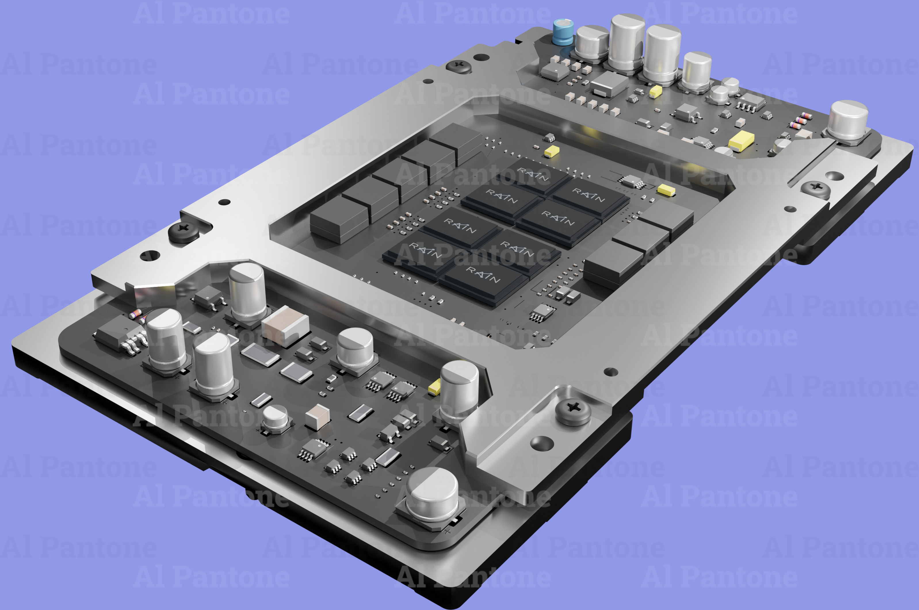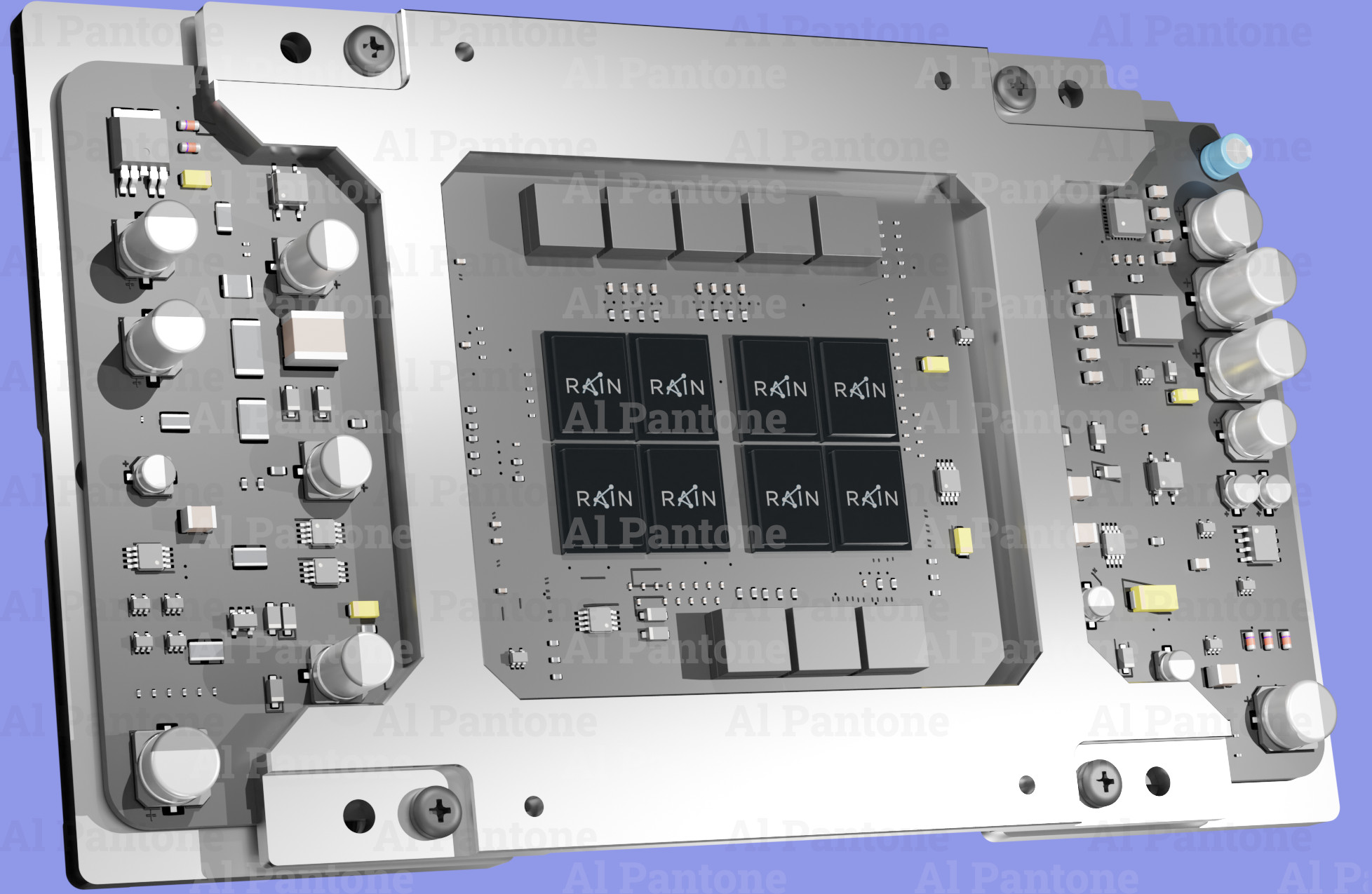 Rendering of a piece of computer hardware in the OCP Accelerator Module format with a logo for Rain AI.