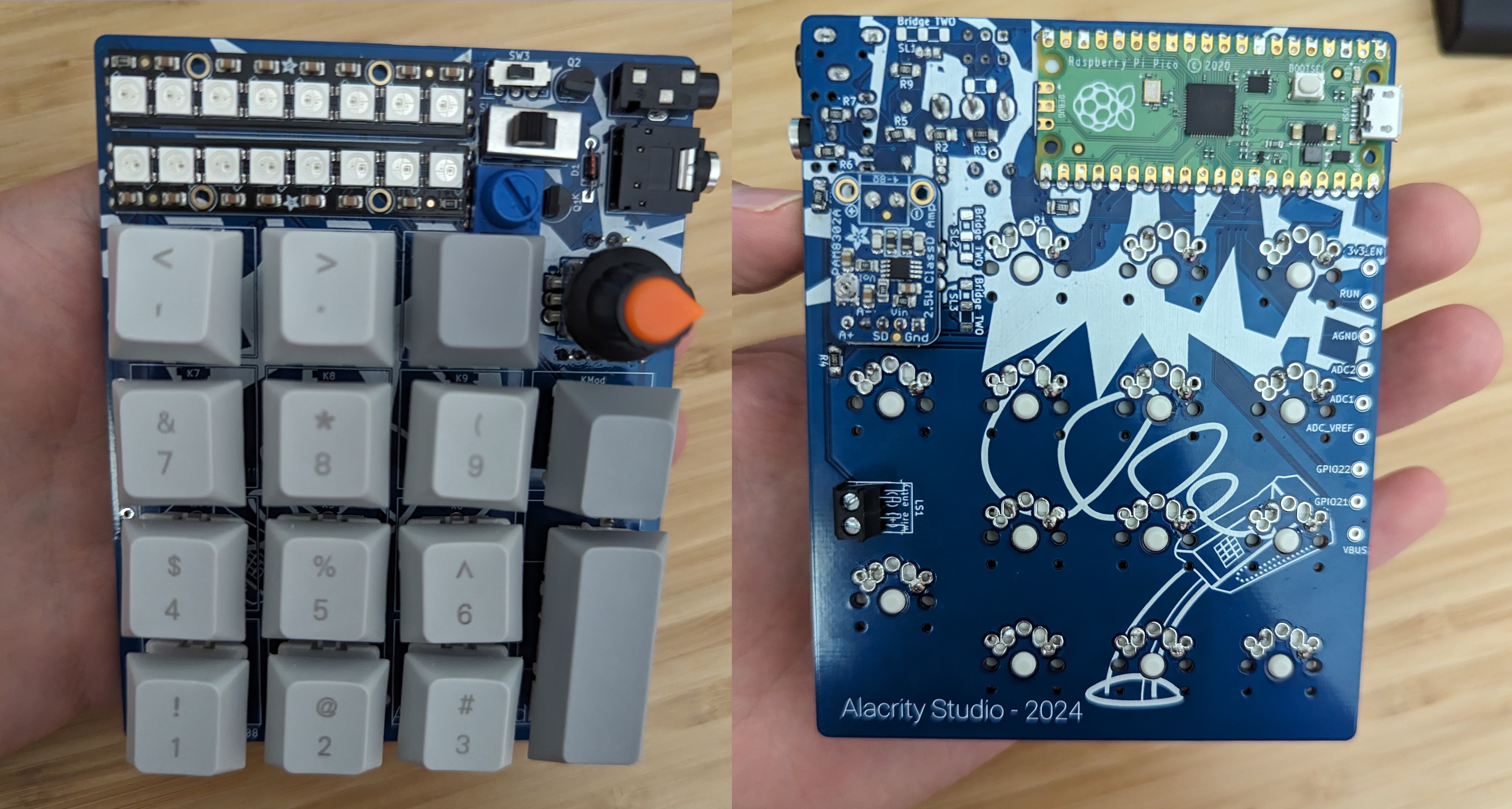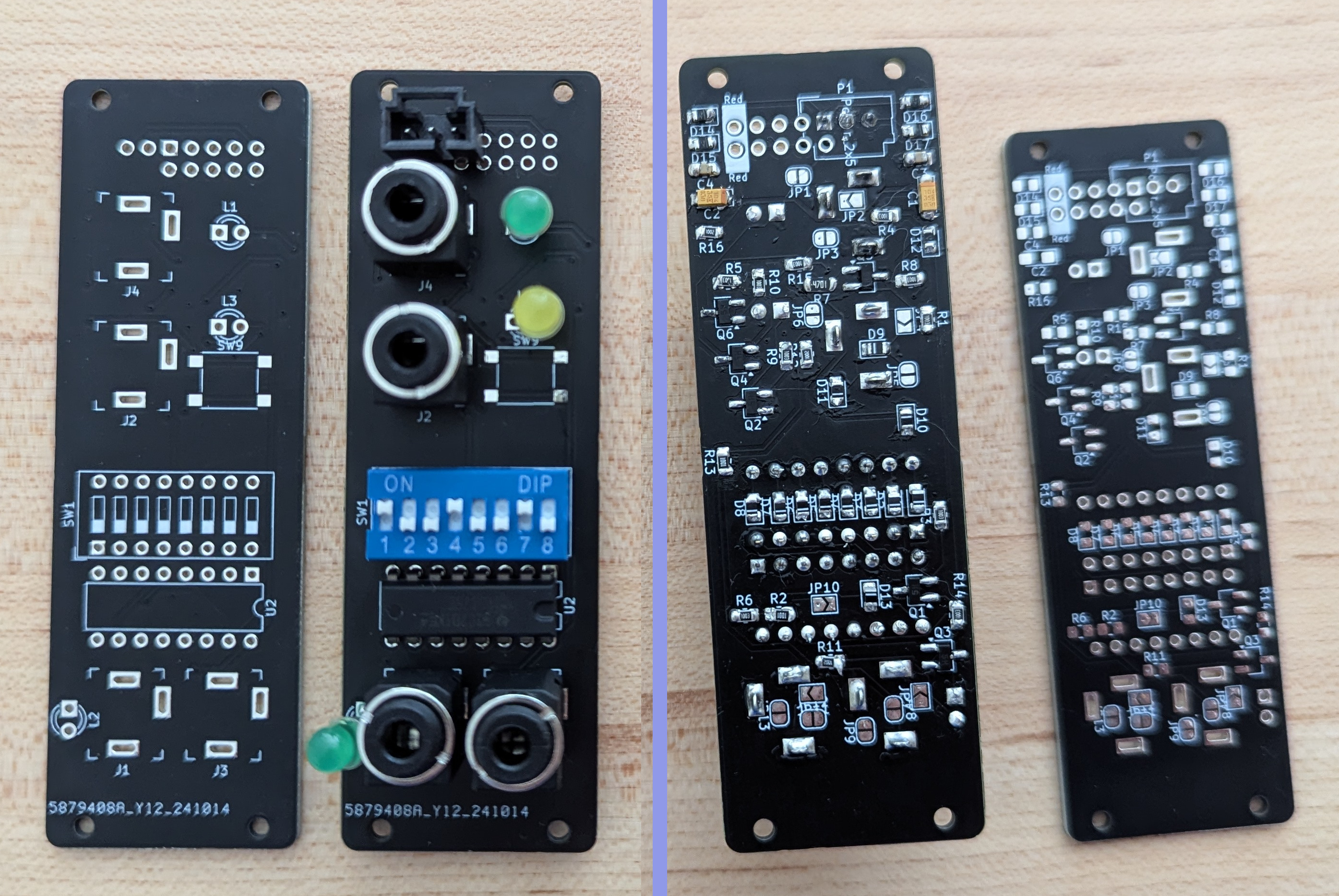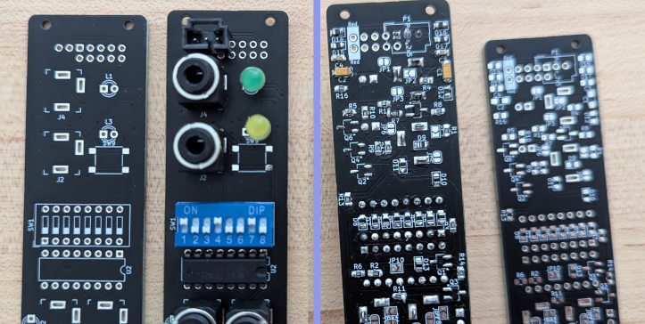 I've only learned PCB design in KiCad less than a year ago, but I'm super pleased with what I've made from scratch already. The Powculator is a sample-based mini rompler with a simple sequencer. It can take audio and sync in (inspired by the Pocket Operator series) and mix that with its own sound for output to a stereo jack or a built-in speaker. It's all powered by a cheap Raspberry Pi Pico. I also just finished a module to drop into my existing synth setup that I'm calling a Clock Skipper. Rather than build a full gate sequencer that produces its own output functions, the Clock Skipper takes any arbitrary wave and mutes it if the corresponding switch is turned off or allows it through unchanged if the switch is on. Great for simple drum beats.